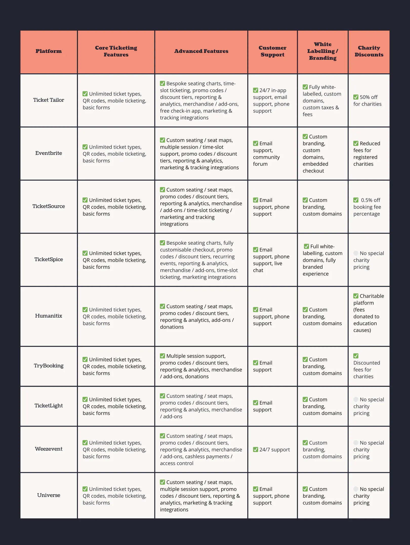 Discover the cheapest ticketing platforms with our handy comparison table – and see how leading ticketing sites fare against Ticket Tailor’s exceptionally low fees.