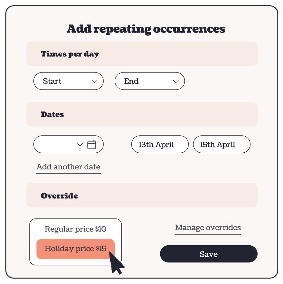 Want to maximise your profits at peak times? No problem. Easily apply override rules to manage peak and off-peak pricing at the drop of a hat.