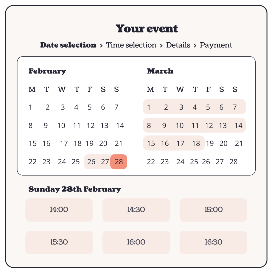 Simplify your ticket buyers' experience with our easy-to-use calendar view, allowing your attendees to choose a date and time to suit them. Our calendar view is ready-to-go on your event pages, and can also be embedded seamlessly onto your website.